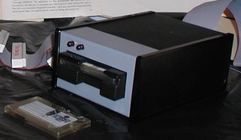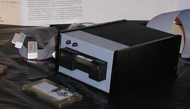 A close up view of the drive belt. Click Image for larger version At first I was able to engage the system, format a wafer, load programs, and save files using the SF with a TRS 80. Just before the Vintage Computer Festival East 2007 the drive belt snapped! I attempted to roll my own belt using a latex band. The results were inconsistent. You can see in the picture above a closeup of an intact drive belt. The belt powers the spindle that moves the "string" past the read head, and that's the only moving part in the drive. I tracked down Robert Howell, the inventor of the Stringy Floppy, and asked him if he had a drive belt in a drawer someplace. He laughed and said he long ago did away with that stuff. We also discussed the history of the Stringy Floppy drive and how it all came about. I will write more on this subject soon. Fortunately I was able to get another SF drive and I am in the process of converting wafers to cassette and/or disk. I will post the results in the blog section. More SF info here Classic Computing Items for Sale:![]()
