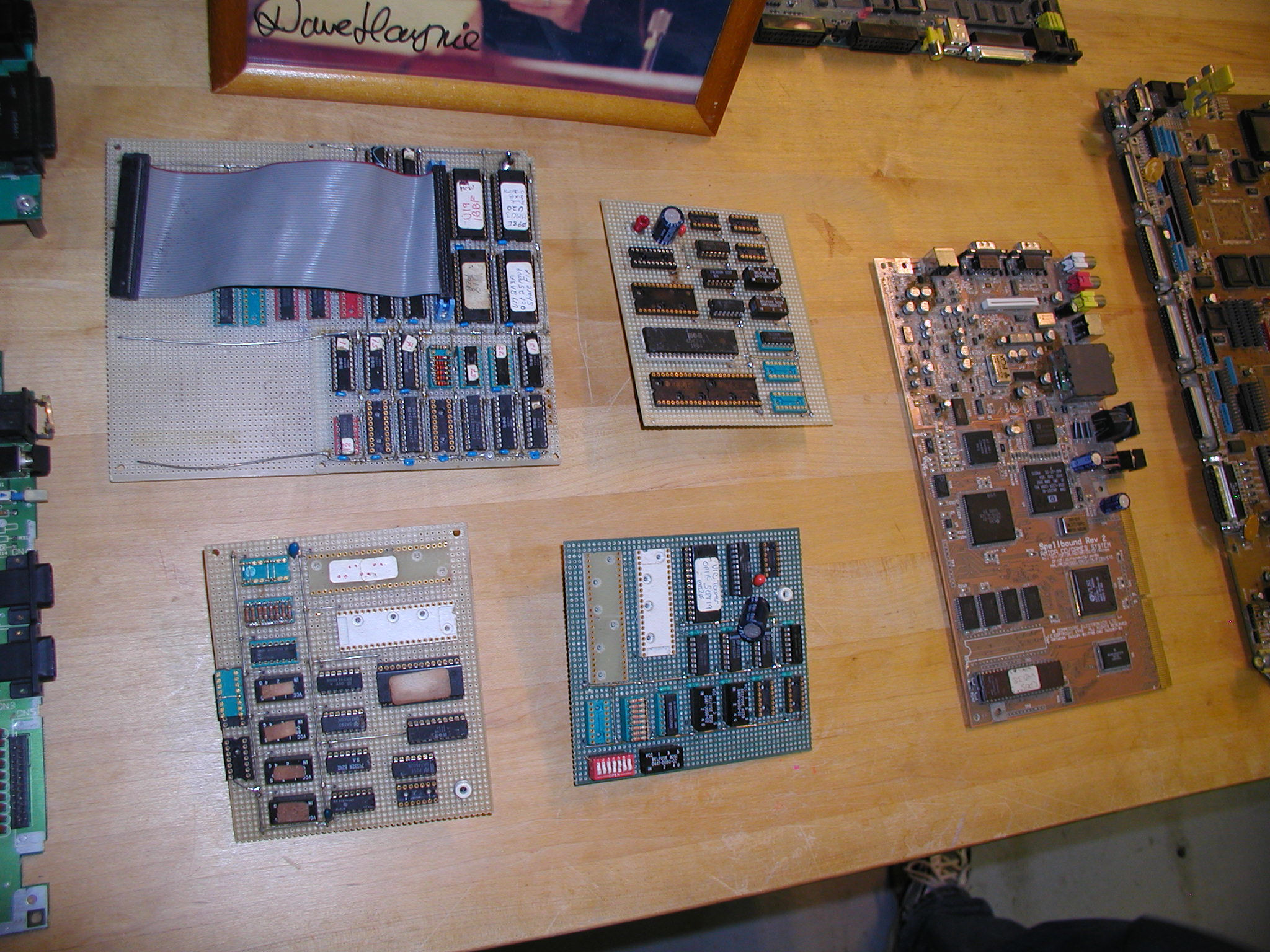 There is an article in the October 1977 issue of Byte Magazine about the National Computer Conference in Dallas, TX June 13-16 describing all of the new computers and manufacturers' wares . Included in the article, on page 54, is a picture of a prototype PET 2001 from the event. Even earlier photos exist from the January 18-20 Gametronics Convention. To my knowledge the Gametronics photo is the first public display of a PET. Note the different front name plate. Compare that photo with the image above and this photo, of a early production PET 2001-8 with the classic blue face plate and monitor. ...Comments? 30 years after the Dallas convention, Chuck Peddle helped commemorate the occasion by speaking at the Vintage Computer Festival East 2007 via Skype video conference. Mr Peddle shared his recollections of how the KIM and PET came to be and described the early days of Commodore computers. Chuck detailed the relationships between Commodore, Microsoft, Apple, CP/M, Bill Gates, BASIC, MOS, and the early computer fairs. Following the video conference, a panel discussion about later Commodore history included former Commodore / Amiga engineers Bil Herd, Bob Russell, and Dave Haynie. These gentlemen brought with them some prototype boards and rare computers from the mid to late 1980s.