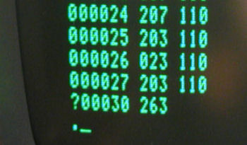 I ordered an 74LS73 and replaced the jumpered socket with the chip from the schematic. That was the last fix needed to complete the restoration, but at the time I did not realize it. I still needed to learn more about how the MITS 88-TPM serial interface worked, and properly interpret screen output. Memory dumps are in OCTAL and not formatted for RS232 output by default. A screen shot of the MITS Altair 8800b Turnkey TURNMON prompt depicting some memory update actions.