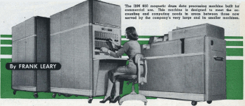 "The IBM 650 magnetic drum processing machine built for commercial use. This machine is designed to meet the accounting and computing needs in areas between those now served by the company's very large and its smaller machines."