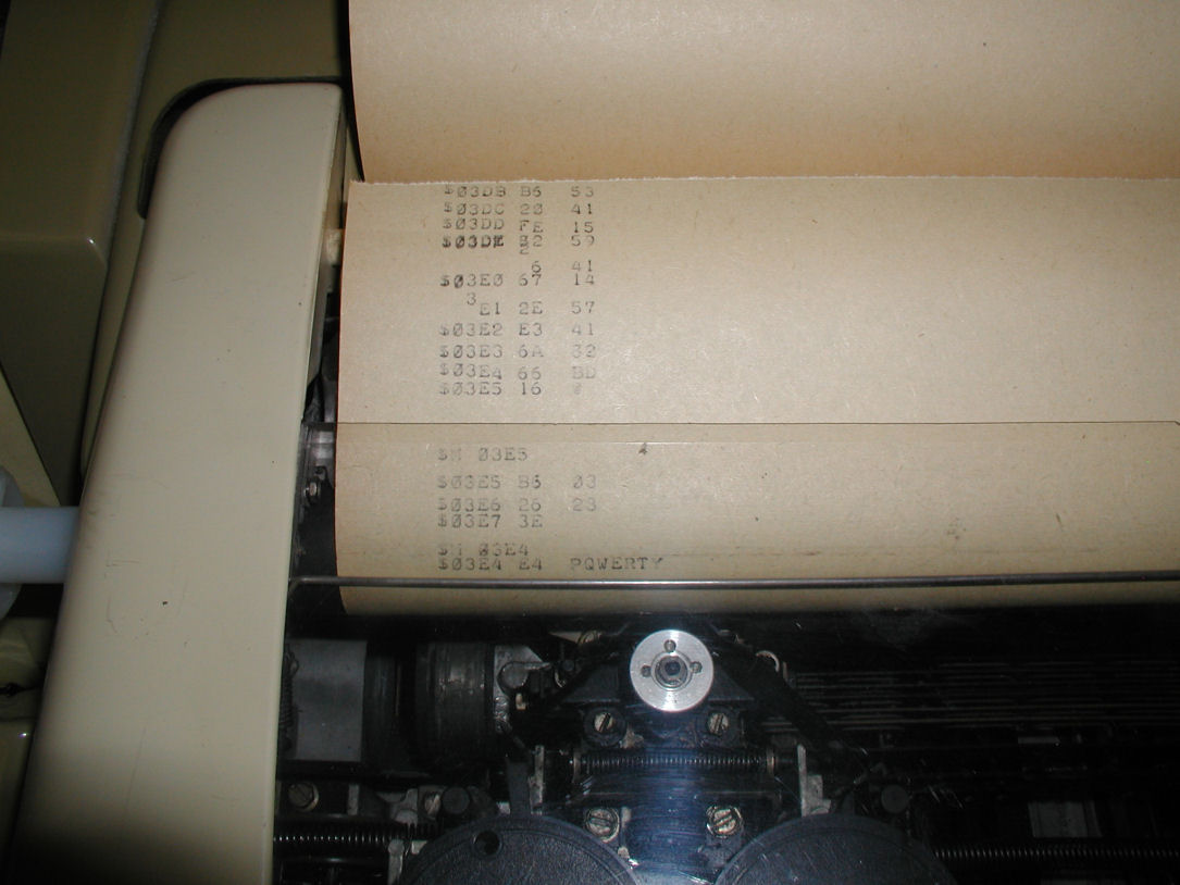 On the Work Bench - Aug 2008These are some of the computers and things that I am currently working on, or have recently picked up. Check my Vintage Computer Blog for updates, or post your questions.Interfacing an SWTPc 6800 using MP-SBob Grieb and Dan Roganti came by for some vintage hardware hacking, and we decided to try and interface an SWTPc 6800 with a Teletype model ASR 33. The SWTPc has an MP-S card installed.To start, the system was set to connect to a 300-baud terminal and it worked just fine. Why not take apart something perfectly good and *downgrade* the speed? Here are some pictures after completion of the project: A printout from the Teletype model ASR 33. Click Image for larger version