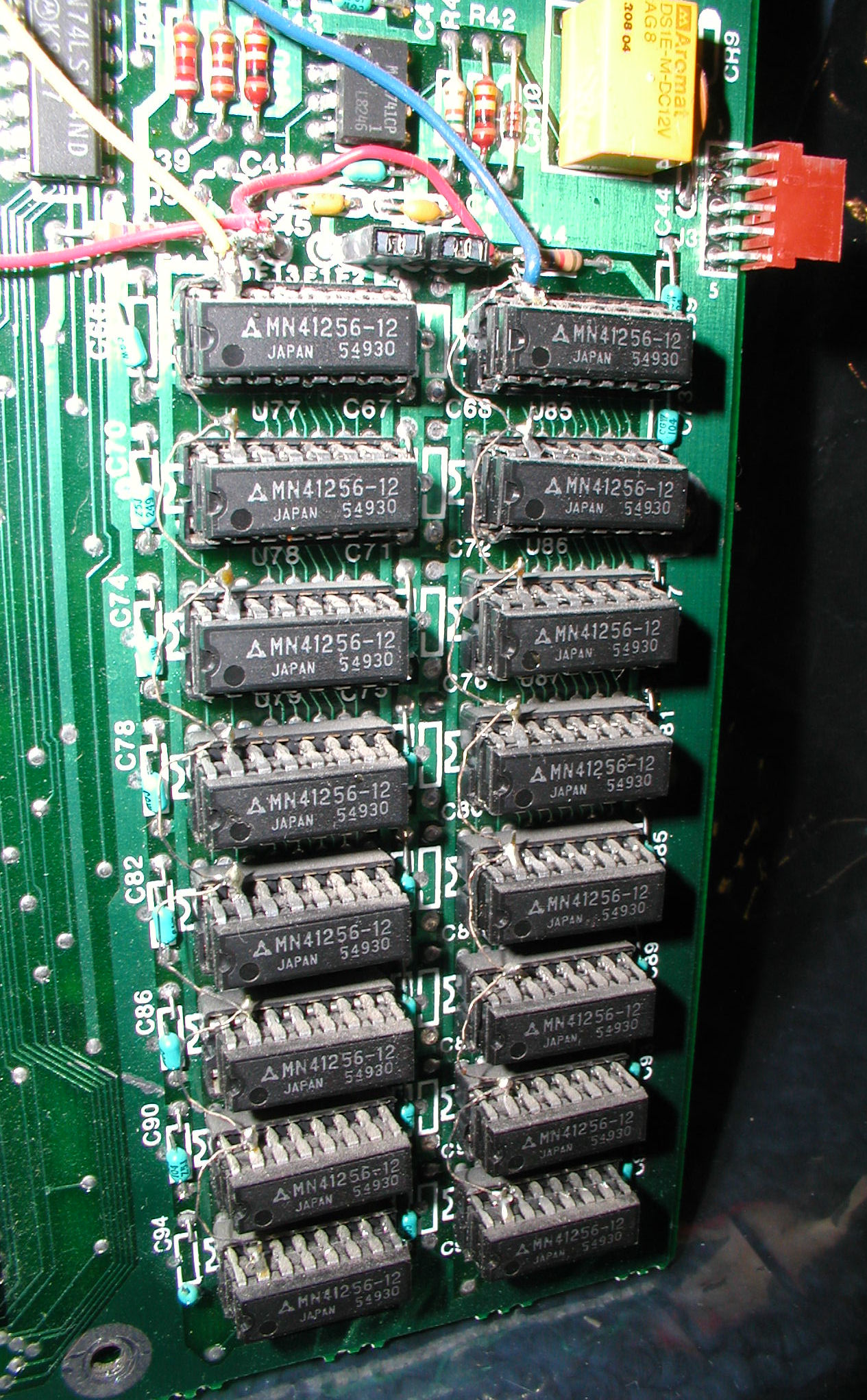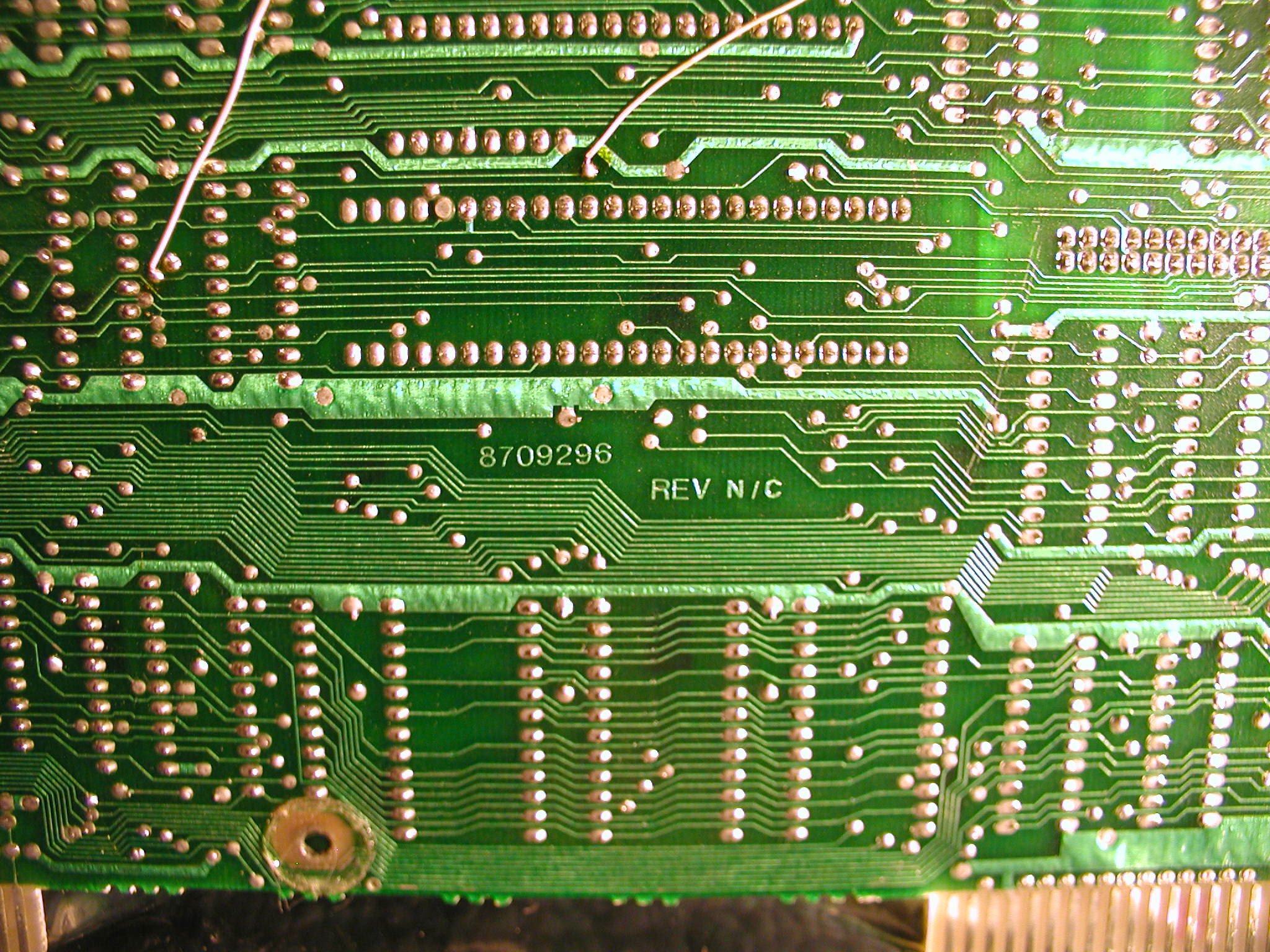 ![]() Photo of the front side, lower left of the motherboard. Note the Alpha Technology RAM expansion daughter board added by Roy Soltoff some time around 1985. Click image for larger view.