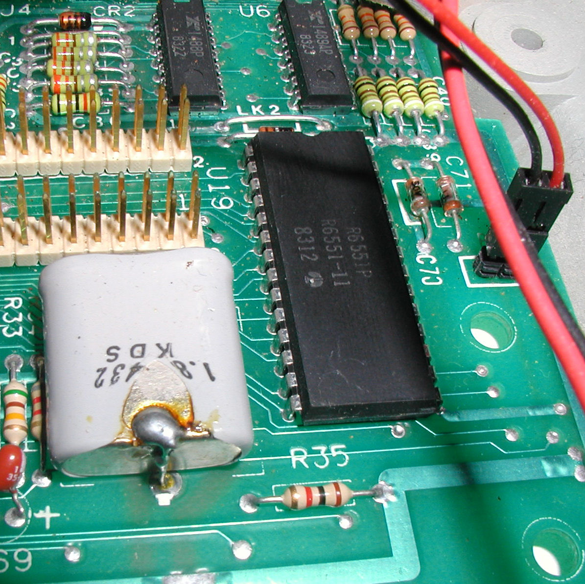 I have to use a step up/step down transformer because this is a 220 / PAL system. After carefully testing the AC input and DC power output I determined that the power supply was correctly sending 12V, -12V, 2.5V, and 5V. There is a TIP29 transistor that seemed to be sending the correct voltages, based on the data sheet. I swapped the English PAL VIC-II chip with a VIC-II from a C-64. The black and white screen above is exactly what you'd expect to see coming from an NTSC monitor when receiving the PAL refresh rate. More Pictures I found this set of instructions on http://landover.no-ip.co...m/index.php?topic=196.0 "...This is a relatively simple change. ...To go from PAL to NTSC you need to swap the MOS 6569 for a 6567, close LK5, open LK4, and swap the crystal at Y1 for the 14.31818MHz one. Lastly make the color adjustment with the small trimmer until you get good color. Make the adjusments VERY SLOWLY with a non-metallic tool. .." The UART crystal needs to be changed too Next: Replace the crystal next to the 6551 chip from the PAL to NTSC version. Reply |