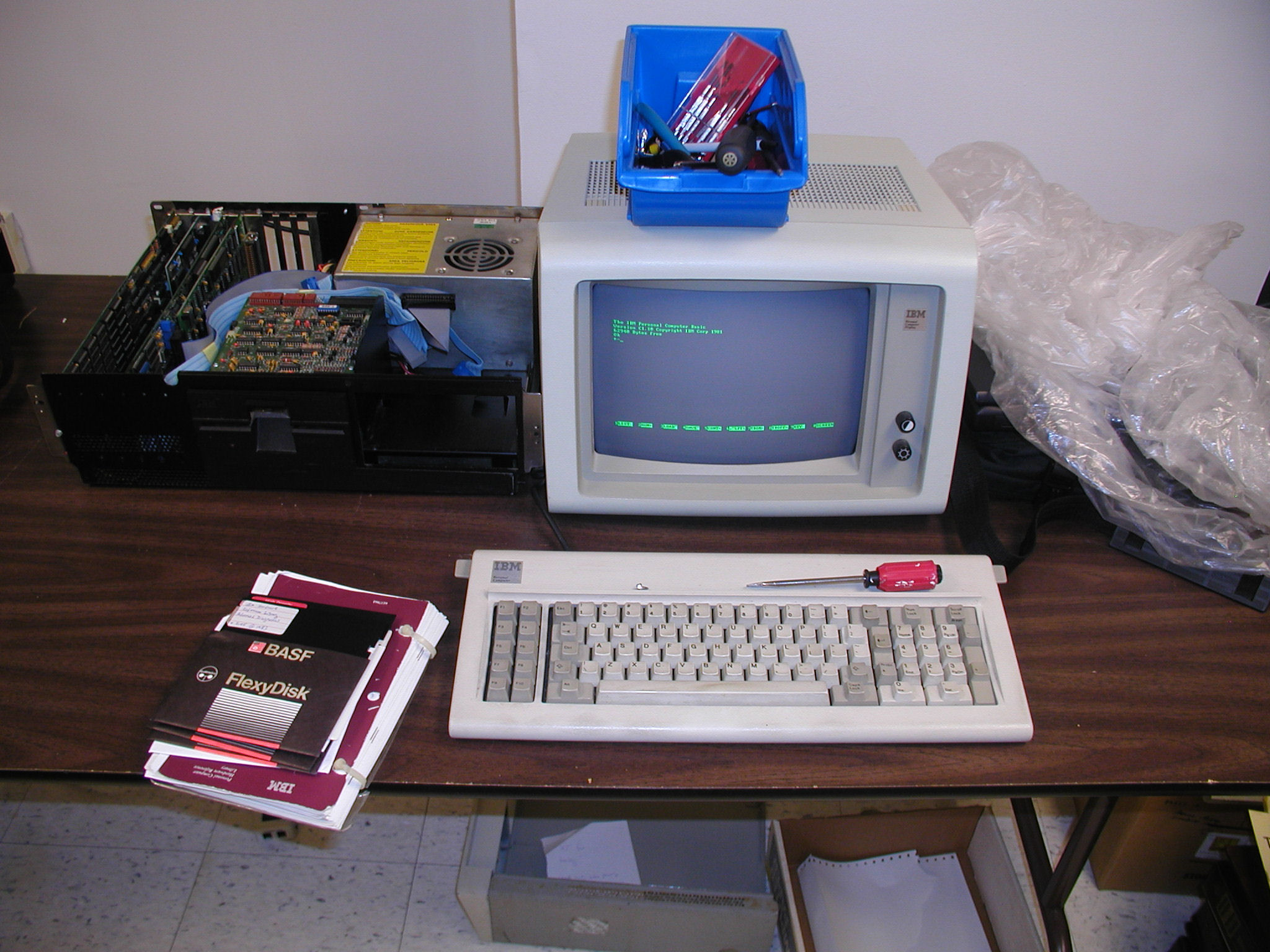 The IBM XT that was used to test disk drives. Today an original IBM 20MB hard drive was saved from the ravages of "stiction". We performed the delicate operation and I think the patient is going to make it.