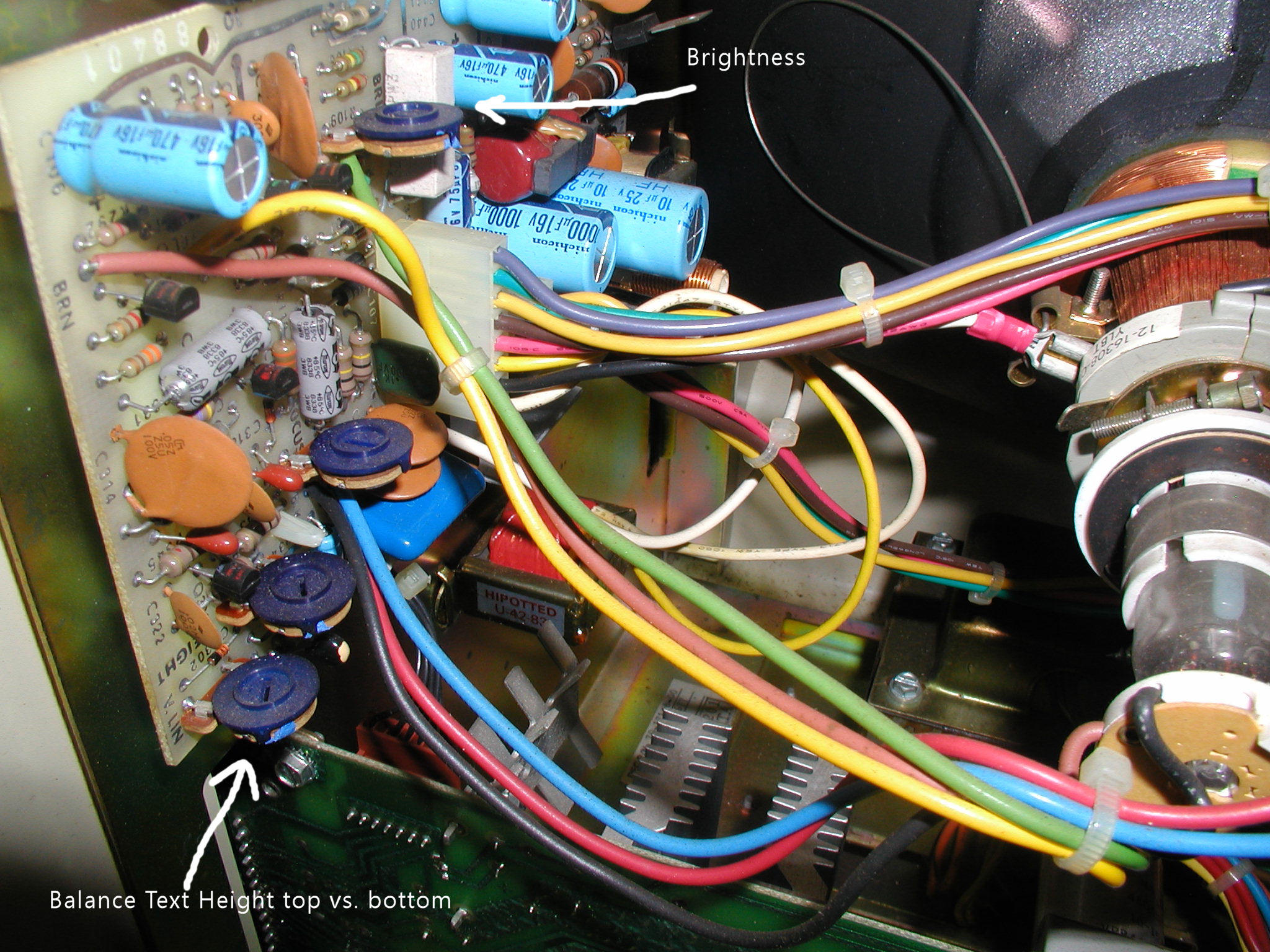 "I think the difference in text size is that there is a capacitor messing up causing the vertical sync to change as it's drawing the screen. I've had 2 Commodore monitors do the something similar (picture had vertical gaps at the top and slowly closed going down, causing text to get smaller) and was told it was a bad cap near the voltage regulators because of the heat." Reply |