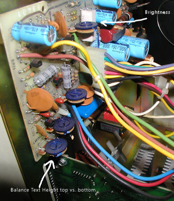 ![]() This picture shows the text size after the linearity potentiometer adjustment. The top and bottom screen text is now the same size. It is likely that there has been some video capacitor decay since the terminal was assembled, but only a small adjustment was needed.