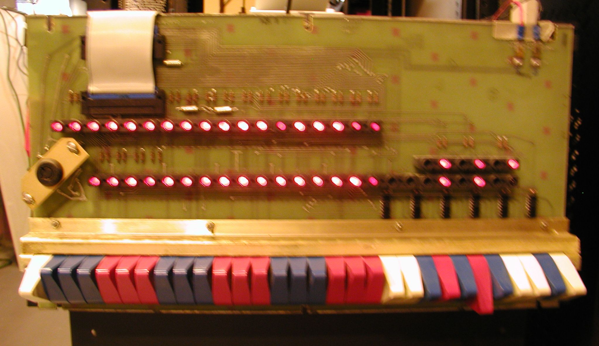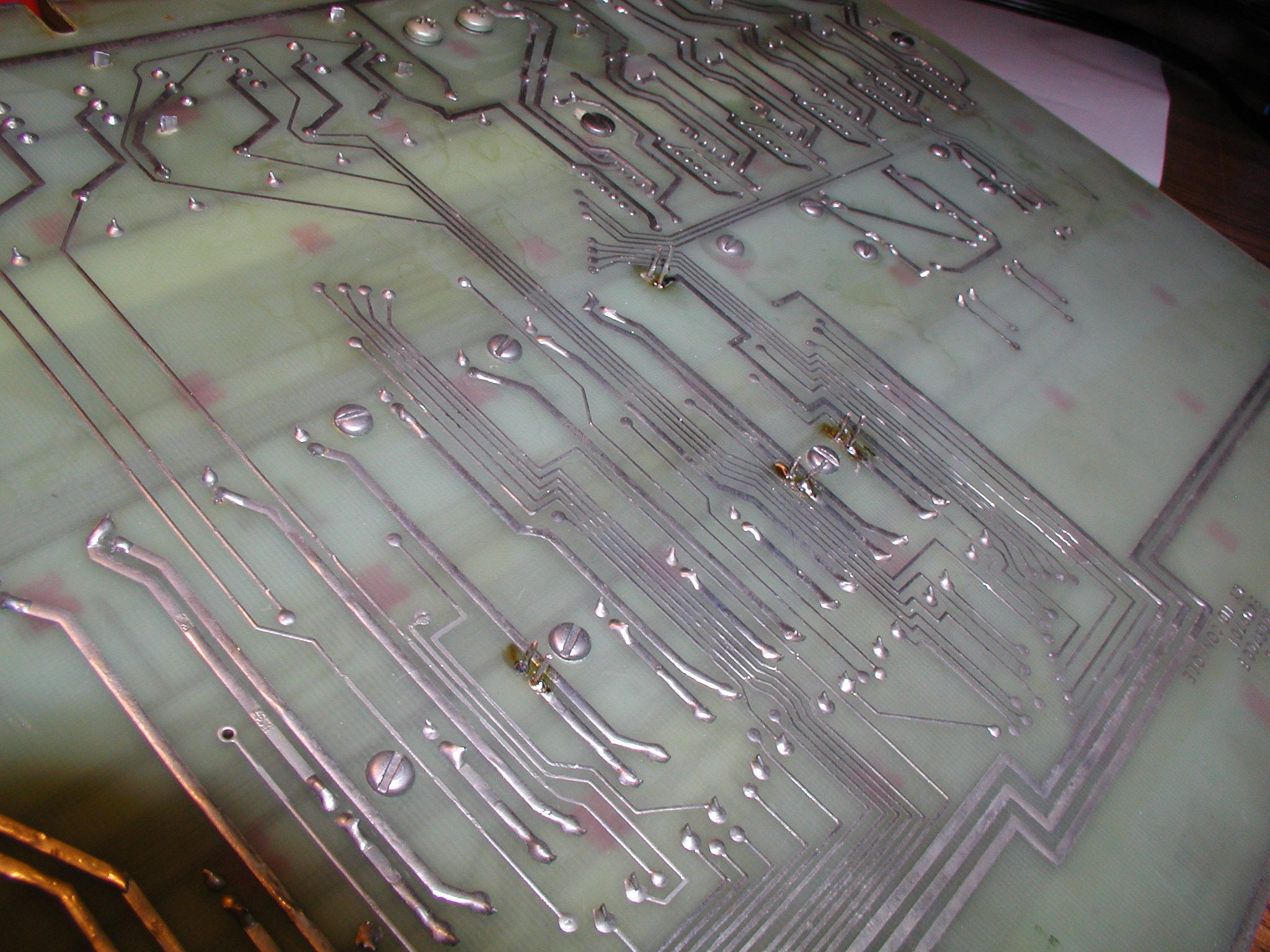 ![]() I removed the dead bulbs and replaced them with bulbs from a donor front panel, that was used in a DEC system but not branded "Digital". Pictured are a few LED cathode/anode pins, poking through the back of the front panel board. Click image for larger view.