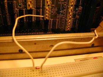 ![]() I put a diode on a protoboard and two wires. With this I touch pins 99 and 100 to ground them and reset the system. The LEDs on the front panel light up when I do. Now at least I can reset the system, a requirement for loading BASIC after running the bootstrap.