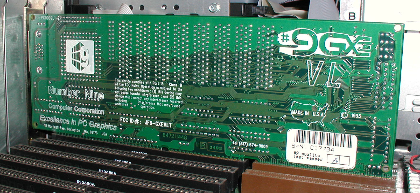 ![]() Pictured here is the rear view of the Number Nine Computer Corporation GXE VL Video card. If I remember correctly my testing revealed the best performance is found with a display capable of 1980 x 1080 60hz. Click for larger view.