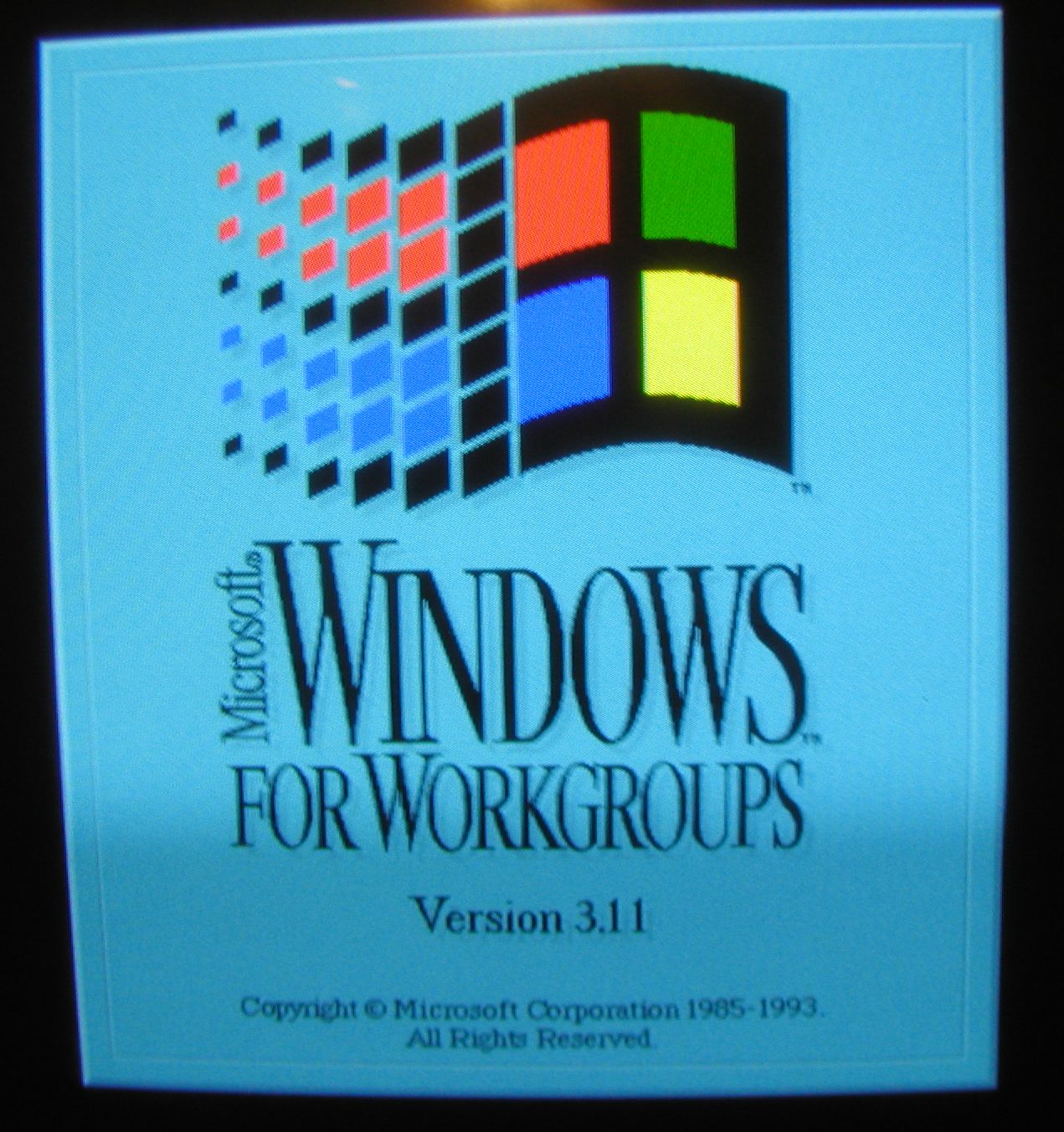 ![]() Windows version 3.11 / Windows for Worksgroups Splash Screen. This version of Windows was what most people had at the dawn of the WWW era, it was a networking extension of Windows 3.1. Click image for larger view.