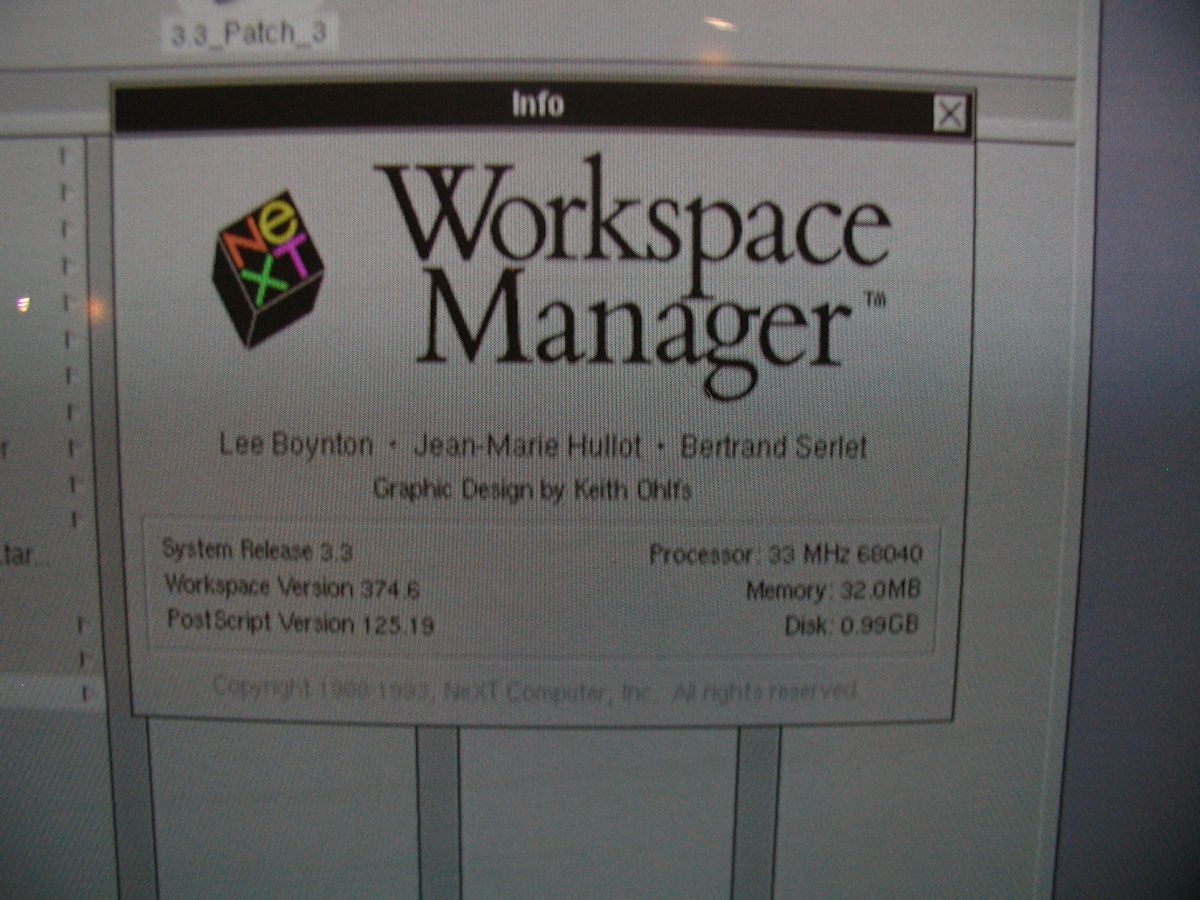 ![]() Next Workspace 3.3 splash screen shows this system is the 33 Mhz 68040 processor model, 32Mb RAM