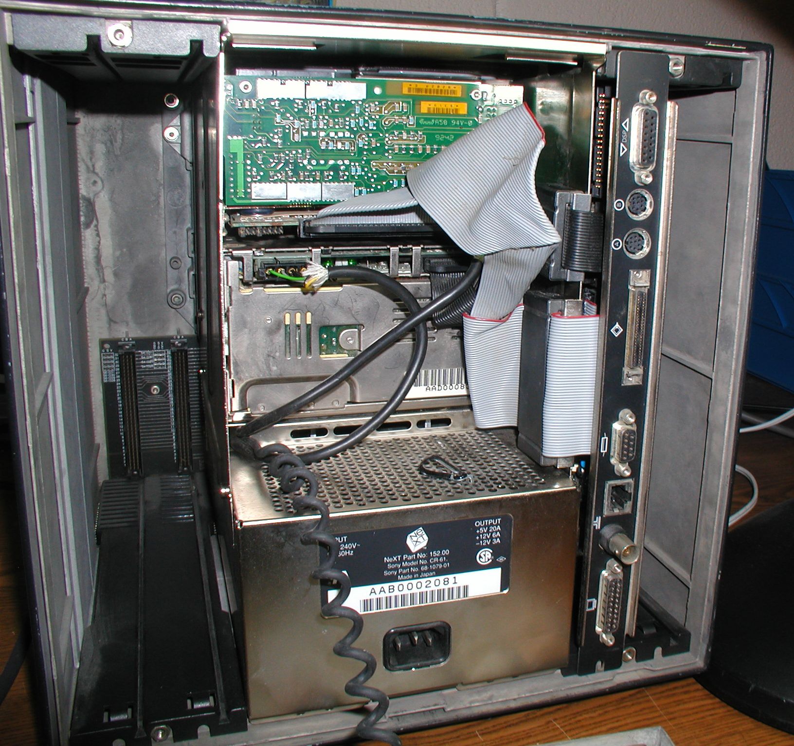 ![]() Here is a view of the NeXT Cube from the front with the chassis, optical drive and inner drive cover removed. The backplane is visible on the bottom with the motherboard (on it's side) and power supply (not visible) plugged into it. The system's internal full-height 5 1/4" hard drive sits unsecured upon the power supply, plugged into the motherboard from the back. The hard drive is an SCSI Seagate ST41200N. Click image for larger view.