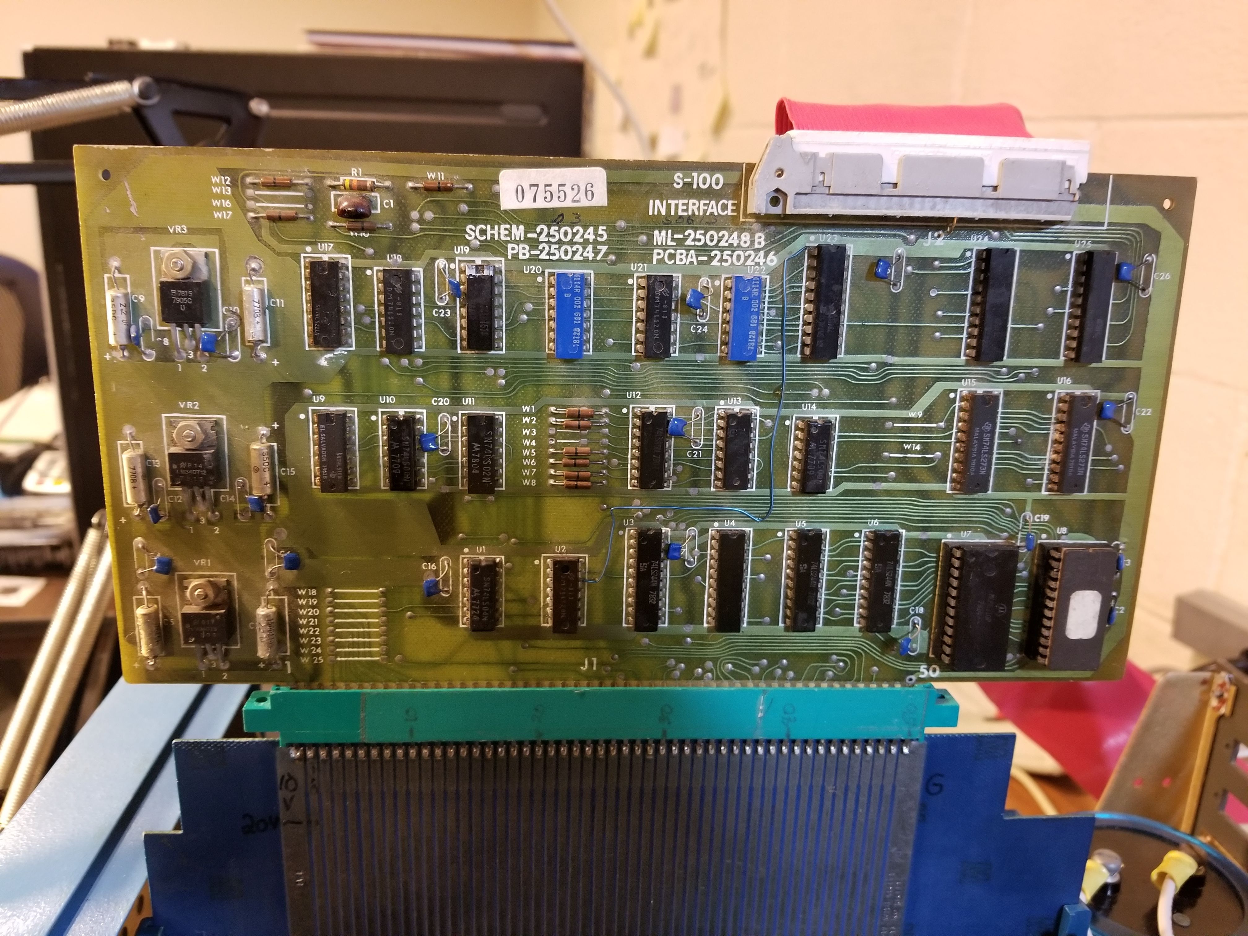 First I discovered that pin 29 (11th from top right while looking straight on at the edge) of the 50-pin flat cable that connects to the S-100 Interface board for 3712 drives is keyed (blocked). This is not the case for 3812 drives. Pin 29 is not used on the 3812 drive, but they started shipping cables without the keyed (blocked) hole on the cable I assume to save money. With this understanding I disconnected pin 29 from the S-100 Interface board and now the 3712 cable fits the card. Further cleaning of the board plus inserting the card directly into the backplane removed the stuck bit 3 problem. The PROM from F000 is now correct for a 3812. That tells me that the card is working ok enough at least to write the PROM contents into memory. To change an S-100 Interface card to 3712 operations from 3812 operations [1] remove jumper W10 and install jumper W9. [x] [2] replace the ePROM with the 3712 version. [ ] Hex file for ePROM offset F000. Here is Mike's page with both 3712 and 3812 prom code and related comparisons https://deramp.com/downl...3812/Interface%20Board/ Time to set up my old ePROM burner! Mike's HEX file is written for intel HEX format. [-] - turns out none of my programmers can handle 2708's. Mike is sending me one and I will try to fix up one of my vintage programmers as a separate thread. Mike recommends this boot disk image https://deramp.com/downl...3712/CPM14-3712-48K.dsk [ ] Reply |