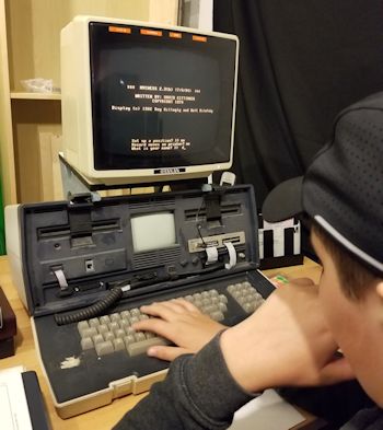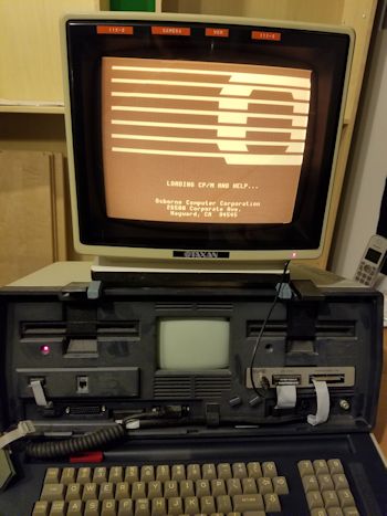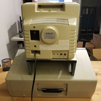 ![]() This Osborne 1b (later models came with with the "bluer trim") includes an innovative external display prosthetic device designed to hold the monitor level on top of the computer while in use. Click image for larger view.