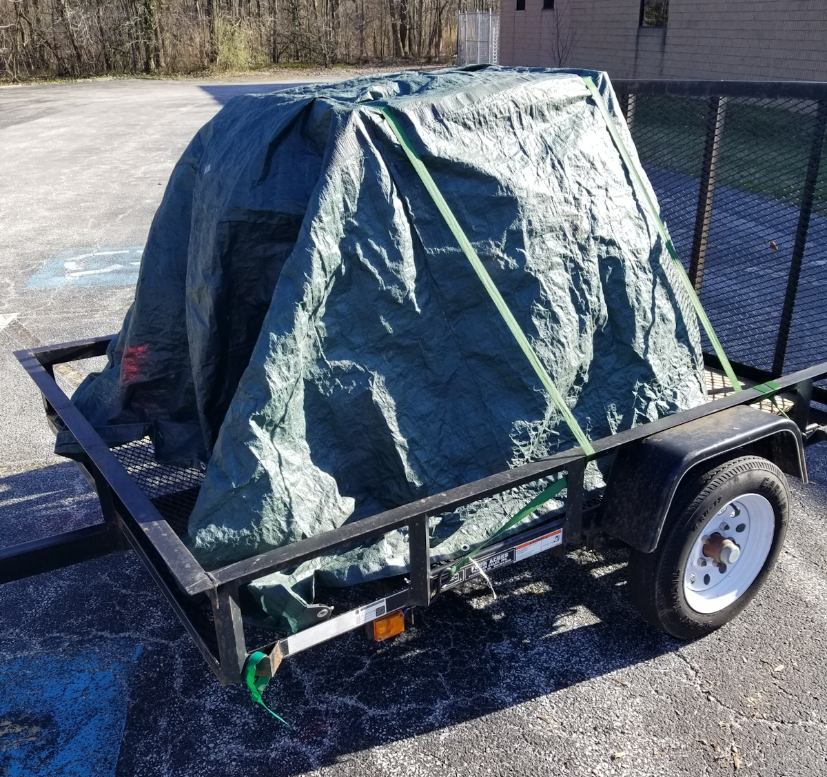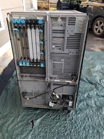 Here's the AS400e after being unloaded from the trailer. It was a herculean effort to get this thing indoors and off the trailer. The side panels were attached after the machine was moved inside. Click image for larger view.