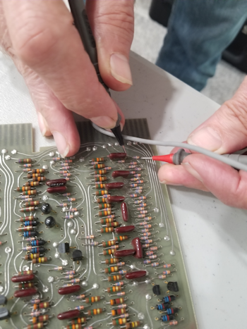 check to see if the machine is going through all 3 cycles. To do se we set up a probe PB25. After probling Dave found that the program works. Dave said intermittant issues, perhaps a timing issue. Dave found that the R602 was not FDE-ing and we replaced P28 Start PC 0041 TAD Fetch MA 0040 MB 1410 A 0000 CONT PC 0041 TAD DEFER MA 0010 MB 4002 A 0000 CONT PC OO41 TAD EXECUTE MA 4002 MB 5555 A 5555 Still had issues. Memory corrupting randomly, setting to all ones when reading or writing. Could be write back does not occur. Suspicious that read is occuring but the write back is not, setting an address to all 111's. So next we tried the toggle-in echo program. failed. Memory corrupted. Wondering - could certain instructions trigger failure? Final thought JMP to increment accumulator is OK. JMP and IOT seems to be causing memory to go all 111's intermittantly. IOT is "talking to a peripheral" so as long as the program does not attempt an IOT it appears to be less likely to corrupt the memory location being read to be executed. Next - Do we see this corruption in other programs? Run a memory test to confirm that no errors occur, as this program does not attempt an IOT. What Else? ![]() Test all cards' forward voltage of all diodes" to 5.5 -> 6V. Transistors - emitter junctions .6, .8 drop when leader are in the right direction. You can use a diode tester for both diodes and transitiors.