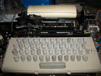 I was able to get the printer parts working adequately, cleaned, and printing fairly evenly. The tops of some keys are not showing on the printout, but I believe I can fix this by slightly raising the print roller or lowering slightly where the keys strike the paper. I used "Goof Off" to clean out the inside of the piston that enters the dash pot. I think it was so gummed up that it was not sliding into place quickly enough. That seems to have fixed the problem described above with the first few characters not spacing correctly. I also adjusted the piston alignment slightly. Next - fix the typewriter. The keys work, but the "0" key sticks and I often have to pull it out of its socket to print "00". I also have to get the CTRL key to sit straighter in the housing, and the BREAK key is not lining up correctly. The Teletype ASR 33 with the cover removed.