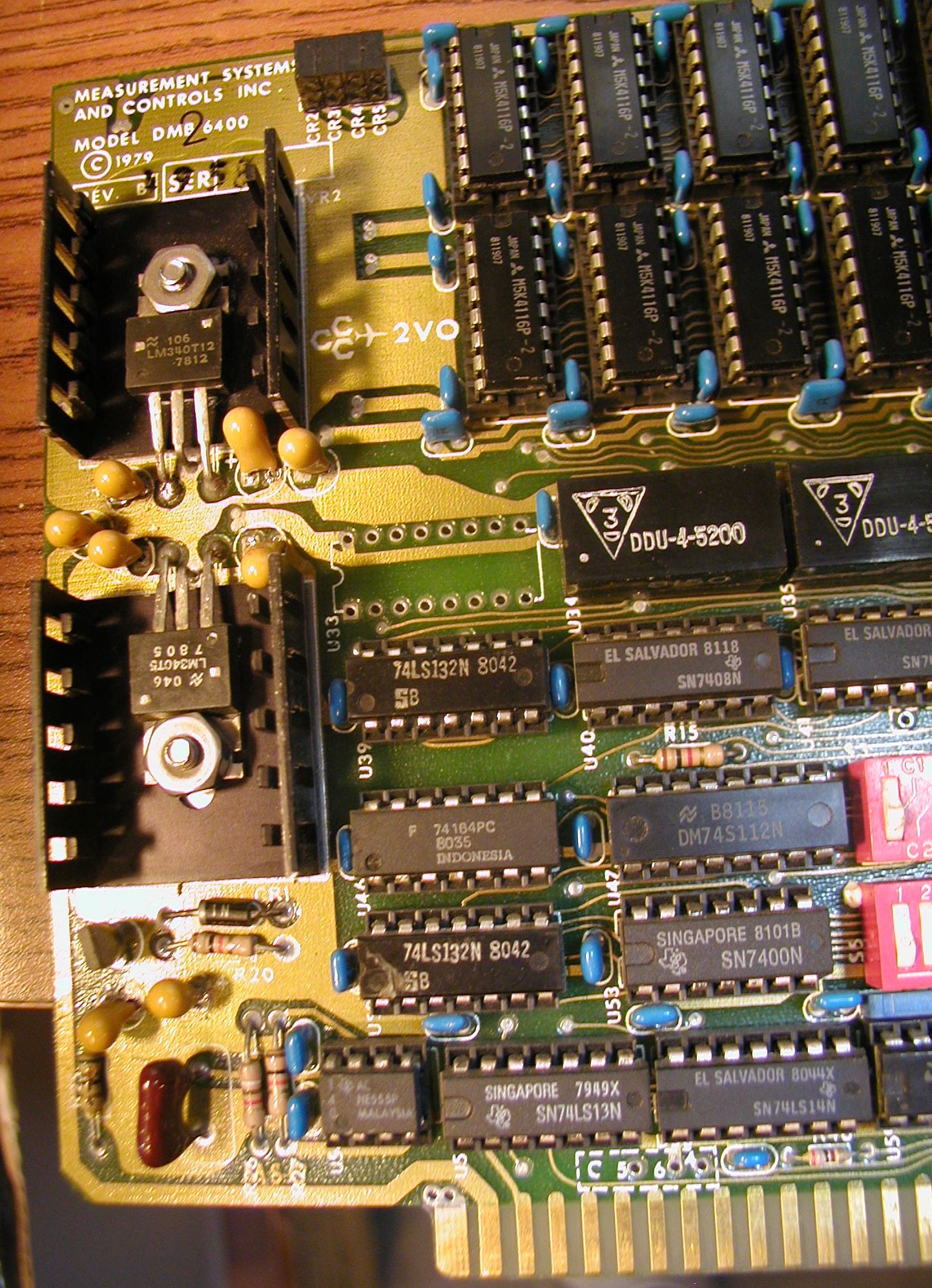 ![]() This photo shows the same "DMB 6400" card from above with repairs completed. Printed on this card is the label Measurement Systems and Control Inc. The new caps are orange not blue and as you can see I figured I might as well do all the 4.7uF 35V caps while I had the thing out. I also replaced the 7805 voltage regulator, which I believe was the cause of the blown cap(s) in the first place. NOTE: Photo was taken without flash and is appears yellower than actual. Click image for large view.