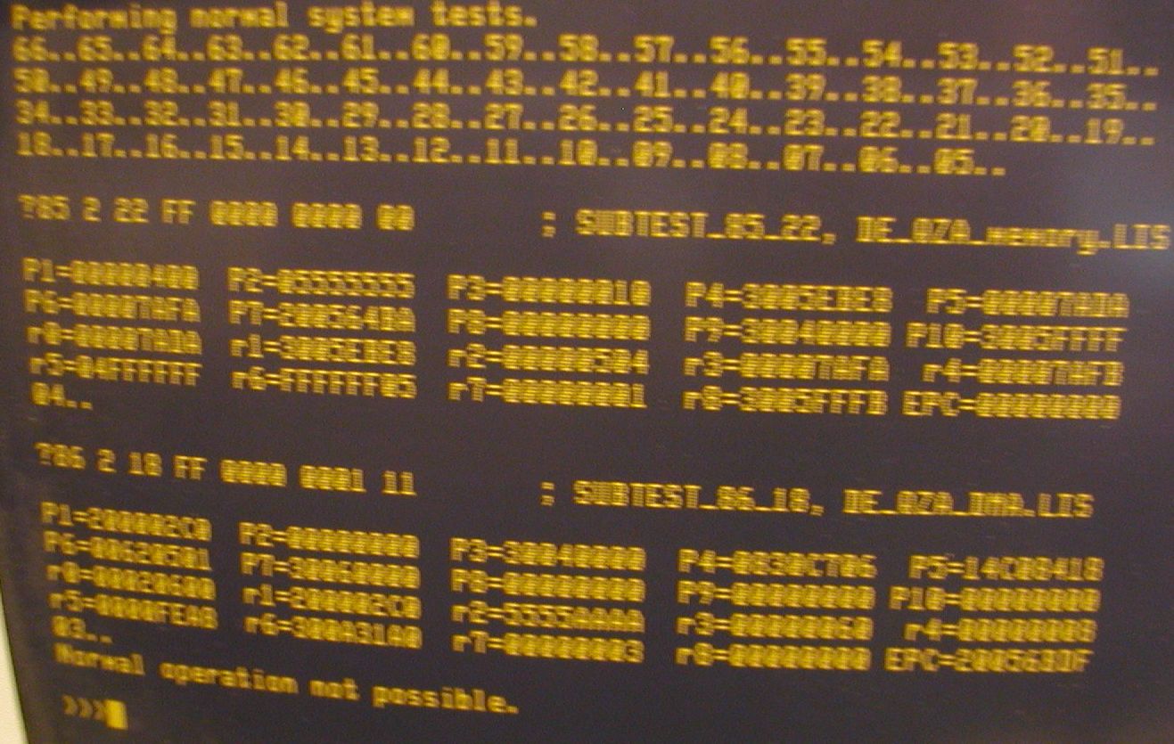 This photo shows the initial status of the computer. The power supply works, but after attempting to initialize, the system returns the errors as displayed on the screen. Click image for larger view.