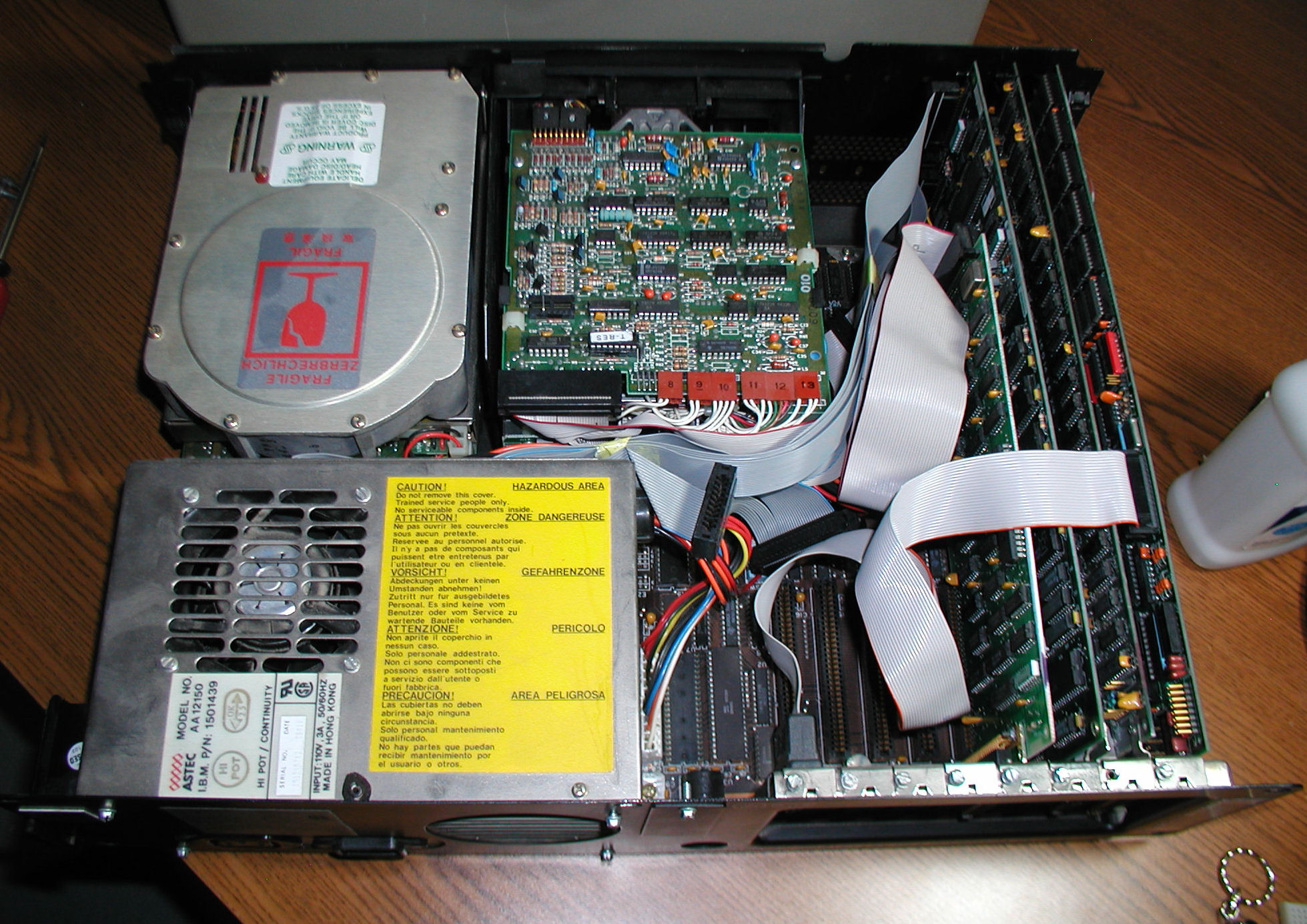A view with the top cover removed. All components are original. AST made a fortune selling their add-on cards, which were often purchased to expand the system at a lower cost than IBM's expansion cards. The capacity of this 5160 motherboard was 256K, the Six Pak contributes another 384K plus serial and parallel ports.