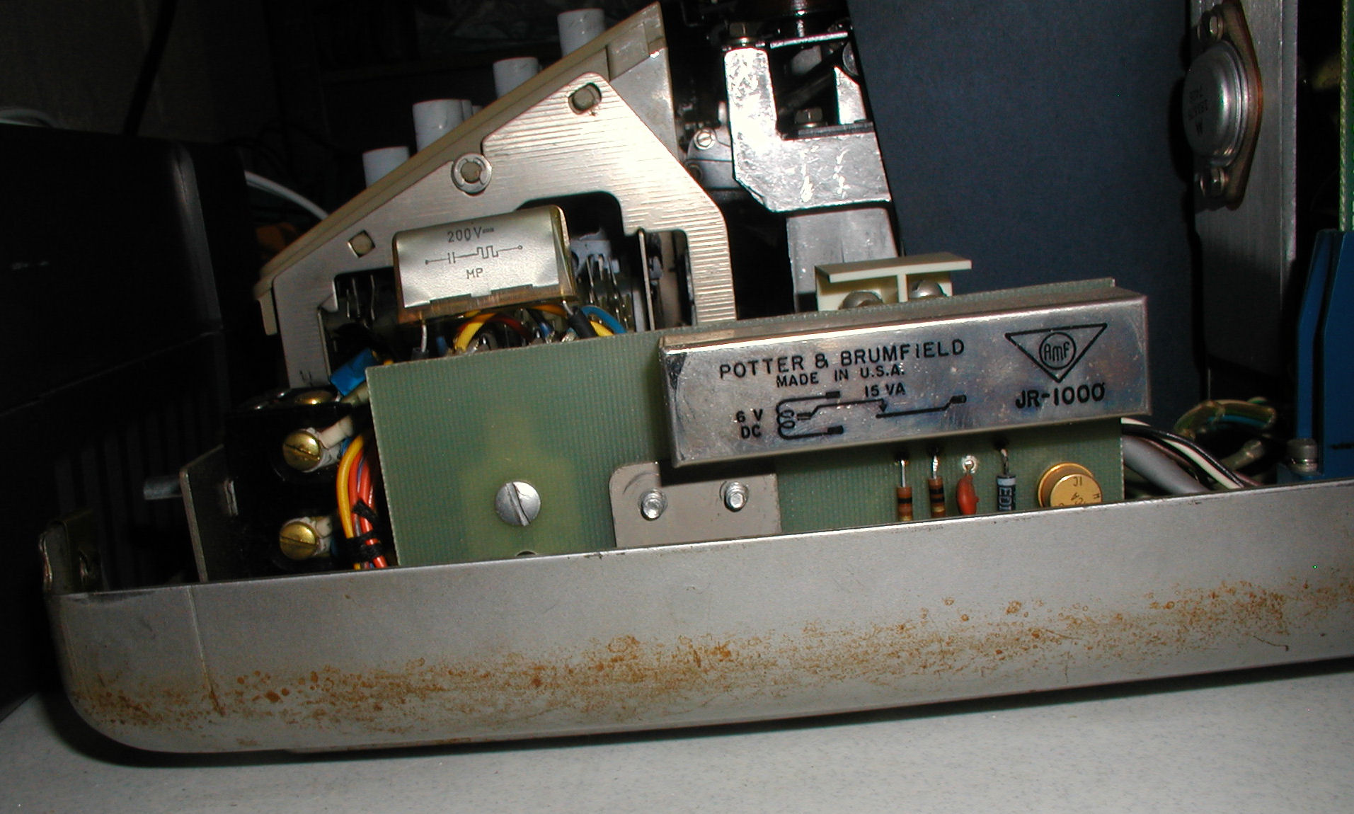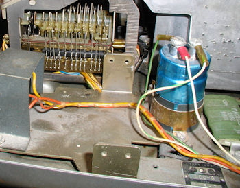 Pictured above is a Teletype Model ASR 33 with the cover removed, from a side view angle just behind the line/local/switch. Note keyboard cams in the upper left. This is a standard/stock configuration. Click image for larger version