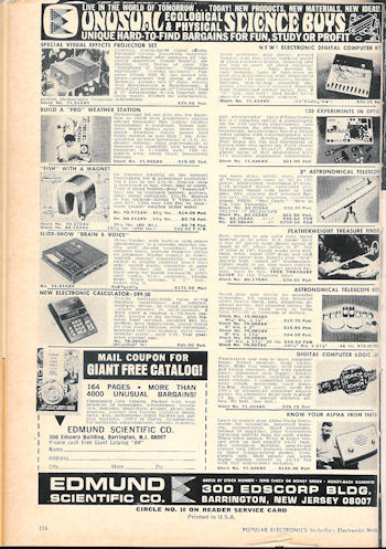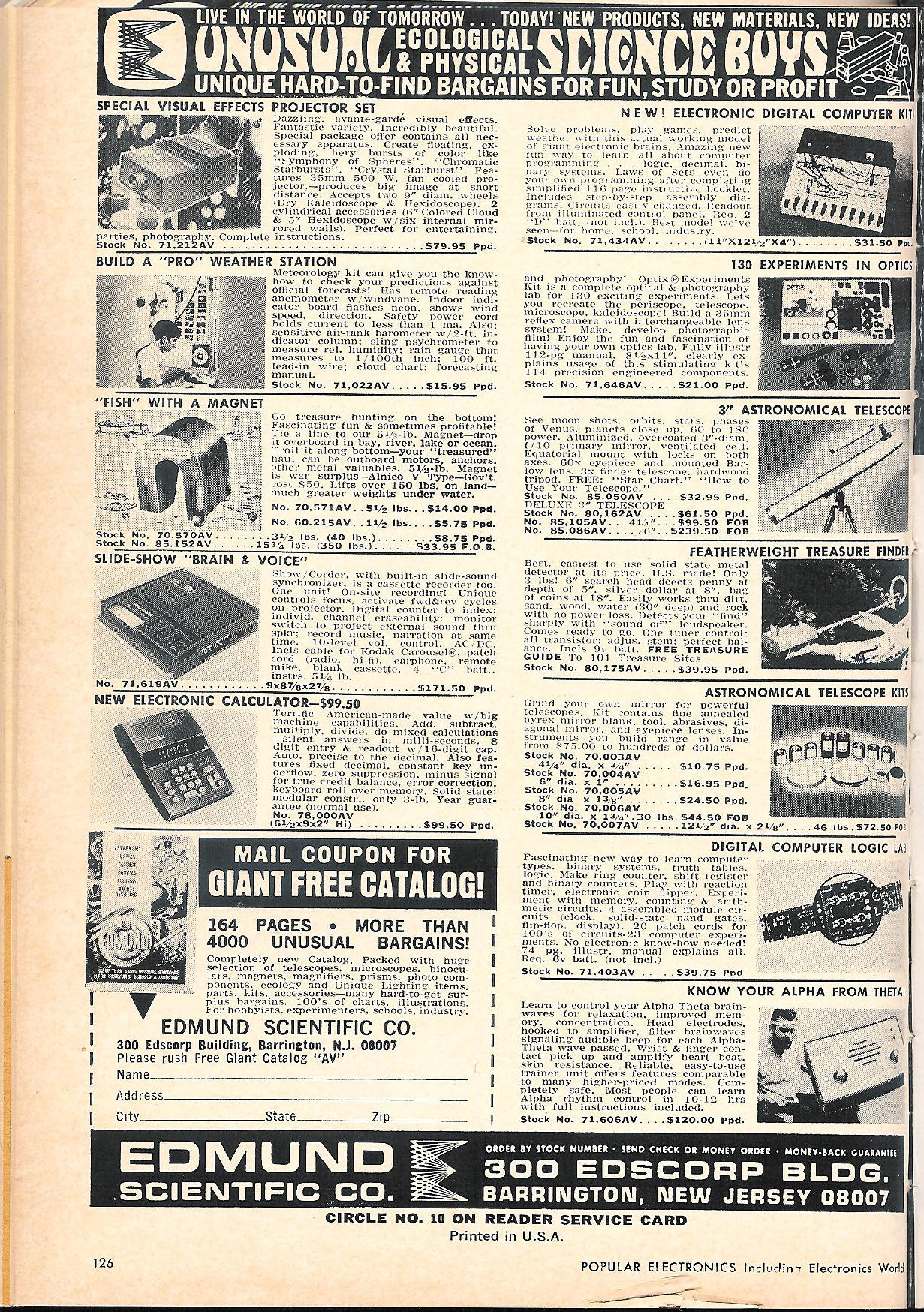 Edmund Scientific Co Ad 1973by billdeg Total messages in this thread: 1 ![]() Advertisement from Popular Electronics January 1973. Note the "New Electronic Digital Computer Kit" in upper right corner. This would be a very early computer kit that pre-dates the Mark 8/Scelbi. At this time I do not know if this was a microprocessor-based system or a Kenbak-type digital computer. The manufacturer is from Barrington, NJ. Click image for larger view. ">... [ read more ]