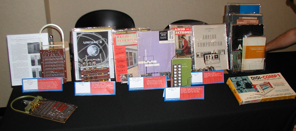 SAGE, UNIVAC Modules and Analogby billdeg Total messages in this thread: 1 Pictured is an exhibit containing plug-in modules from the mainframe era of computing, plus a module from the Donner 3500, manuals, and a Digi-Comp 1. Click image for larger view