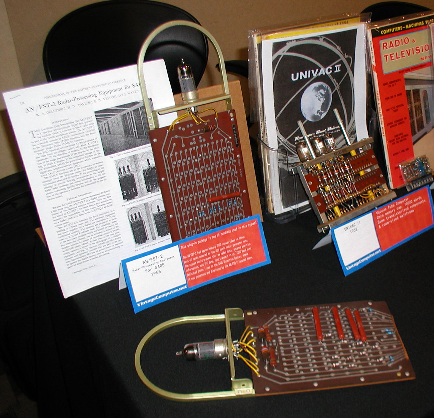 To the left is a plug-in module from the SAGE radar processing unit called AN/FST-2 (1955). The SAGE was a huge mainframe and there would have been hundreds of these modules in a single AN/FST-2. The AN/FST-2 had approximately 7100 vacuum tubes in three bays of racks, powered by two 400 cycle motor generator sets. The system would process the raw radar data, antenna position inform">... [ read more ]