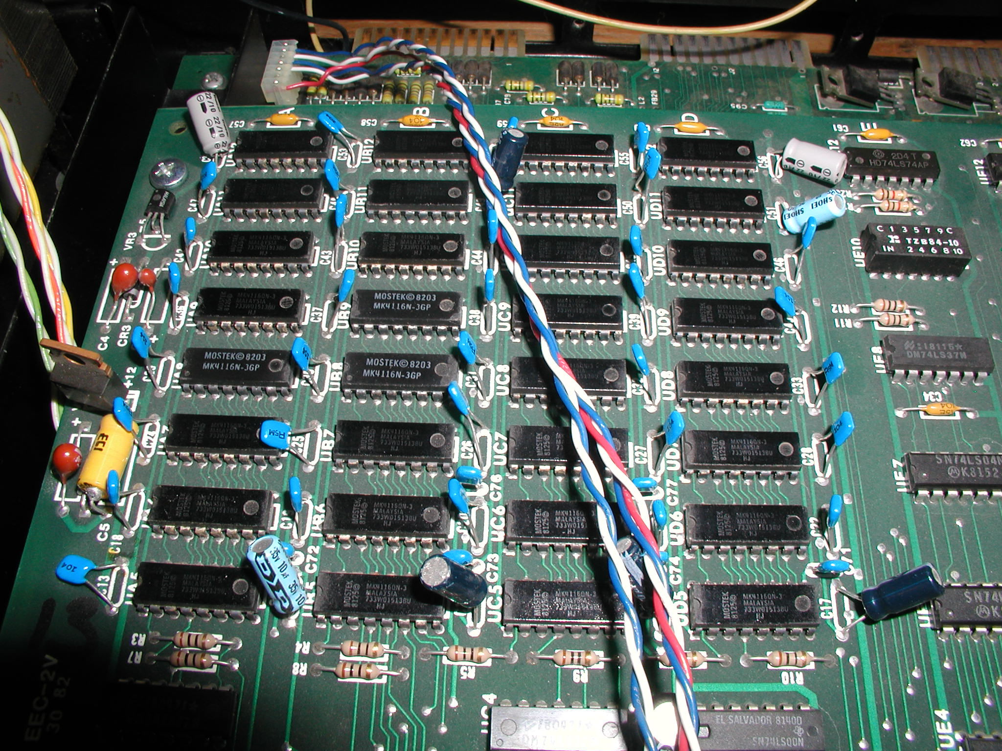 Because I don't have a working PET 4032 motherboard I decided to install a PET 64K memory expansion kits in one of my 8032's instead. The memory expansion board consists of 32 4116 chips. The Motherboard's 6502 is moved to the memory board.