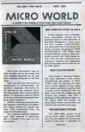 Micro World Sept. 1976by billdeg Total messages in this thread: 1 "A Computer Newsletter for the East Coast" (USA) ![]() Click image for PDF to download. This is a home-brew 'zine (note spelling "intorductory") example probably included in the goody bags of registrants to the Personal Computing 76 Consumer Trade Fair in Atlantic City, NJ. The event was August 28 and 29, 1976. ">... [ read more ]